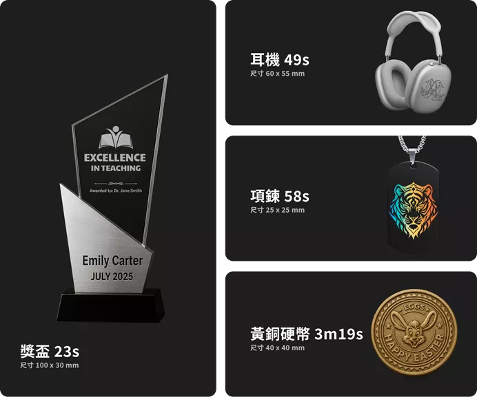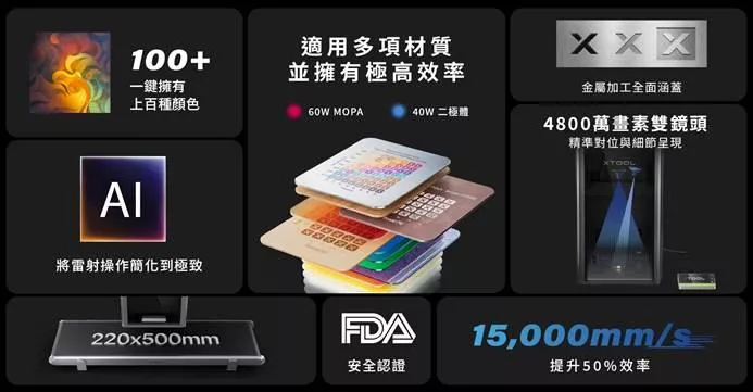 • 雷射功率: 40W 藍光 + 60W MOPA (一機雙效)